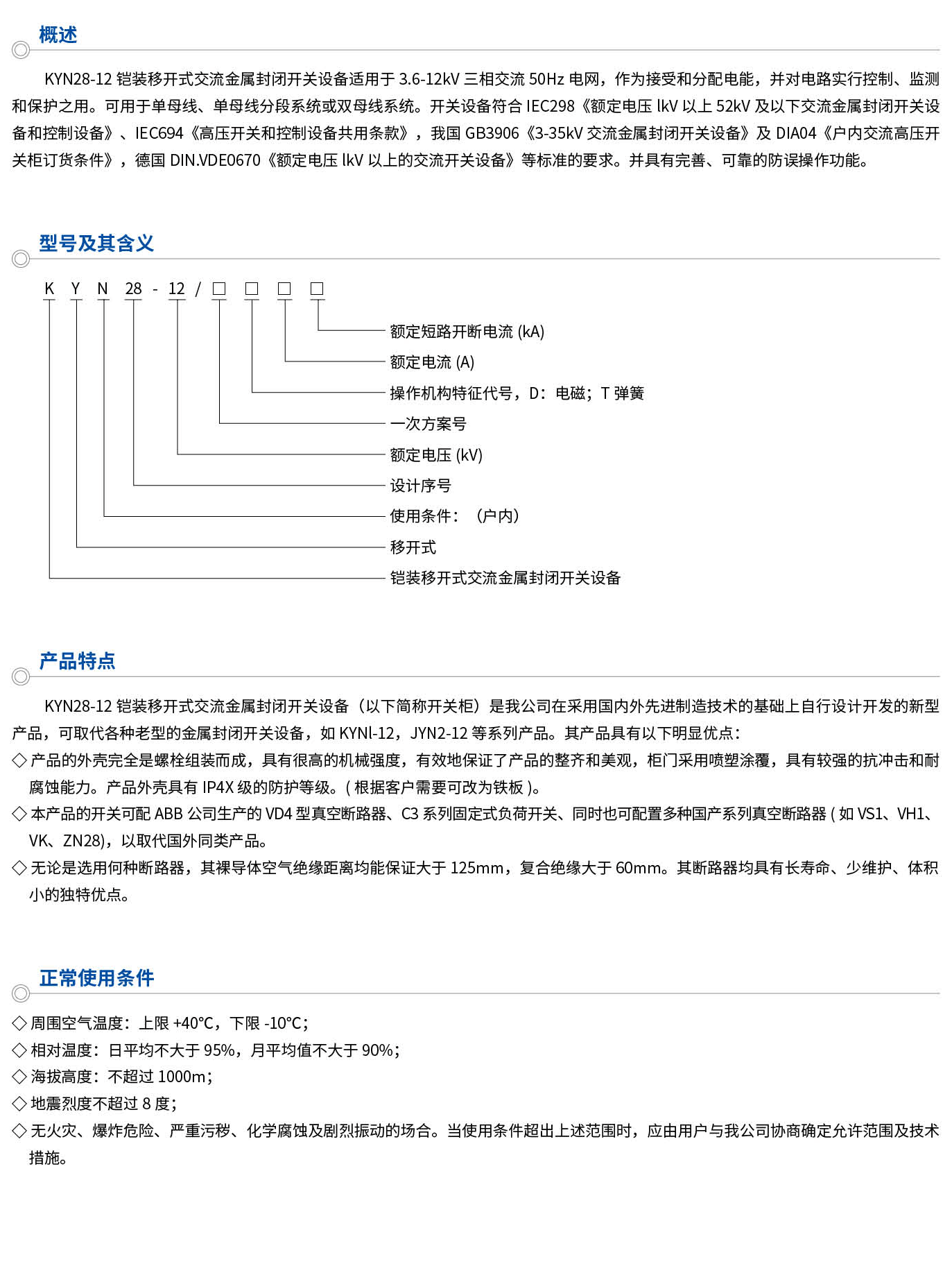 KYN28-12鎧裝移開式交流金屬封閉開關設備適用于3.6-12kV三相交流50Hz電網,作為接受和分配電能,并對電路實行控制、監測和保護之用。可用于單母線、單母線分段系統或雙母線系統。開關設備符合IEC298《額定電壓kW以上52kW及以下交流金屬封閉開關設備和控制設備》、IEC694《高壓開關和控制設備共用條款》,我國GB3906《3-35kV交流金屬封閉開關設備》及DIA04《戶內交流高壓開關柜訂貨條件》,德國DN.VDE0670《額定電壓kV以上的交流開關設備》等標準的要求。并具有完善、可靠的防誤操作功能。