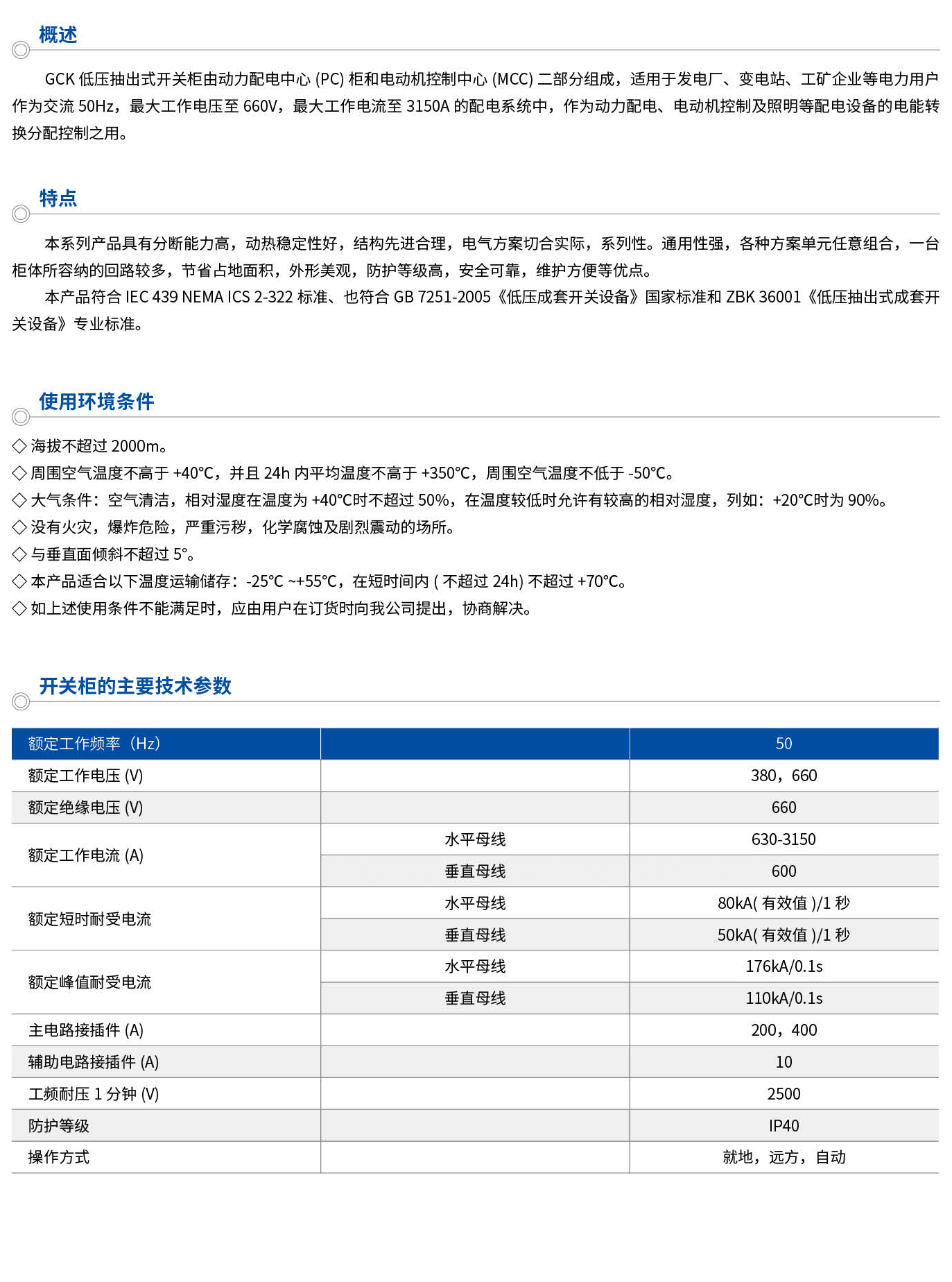 GCK低壓抽出式開關柜由動力配電中心(PC)柜和電動機控制中心(MCC)二部分組成,適用于發(fā)電廠、變電站、工礦企業(yè)等電力用戶作為交流50Hz,工作電壓至660V,工作電流至3150A的配電系統(tǒng)中,作為動力配電、電動機控制及照明等配電設備的電能轉換分配控制之用。